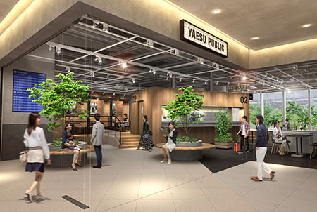 Found on 2F, Yaesu Public is a new kind of public space where people, places and culture overlap. Split into three zones, it houses unique, small-scale shops that include restaurants, drinking establishments and retail stores. The easygoing area also features seating for dining and working.