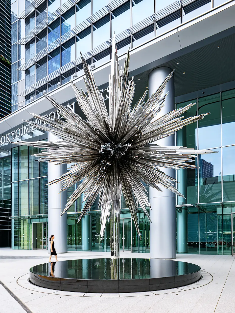 On the other side of Tokyo Station, you’ll find a number of public artworks in and around Tokyo Midtown Yaesu, the shopping complex which had its grand opening in March 2023. Out in front of the Tokyo Midtown Yaesu entrance you can find “STAR” created by Tokujin Yoshioka. This permanent installation is around 10 meters high, and made of over 2,000 octagonal and mirrored stainless steel rods, which reflect the sunlight to create a luminous sculpture. It represents a beacon of hope.