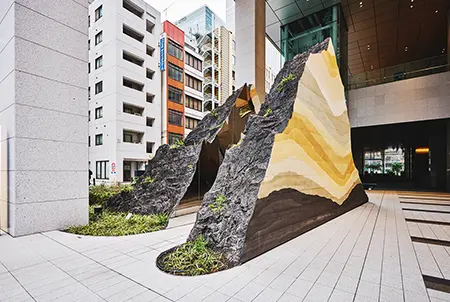 Outside, on the corner of Aogiri Street and Yanagi Dori Street, you’ll find “Mountain range” by Takashi Kuribayashi. His work often explores “boundaries,” and aims to reveal the “invisible world” where truth resides. This work uses the hanchiku (rammed earth) technique and soil collected from all over Japan to create strata, which reflect the layers of history and memory in Japan and Yaesu. The gray area in the center uses soil that the artist collected from 30 meters underground during the construction of Tokyo Midtown Yaesu. The cracked interior of the mountain is made of mirrors.