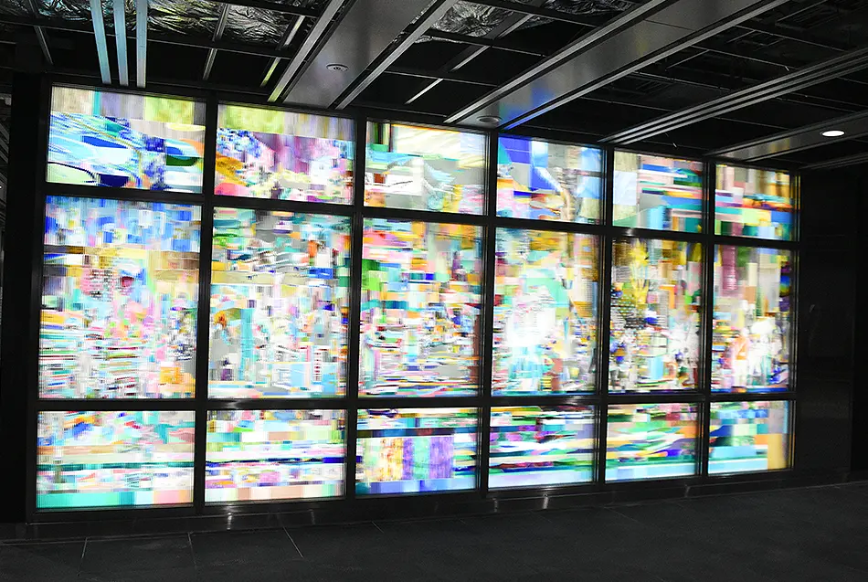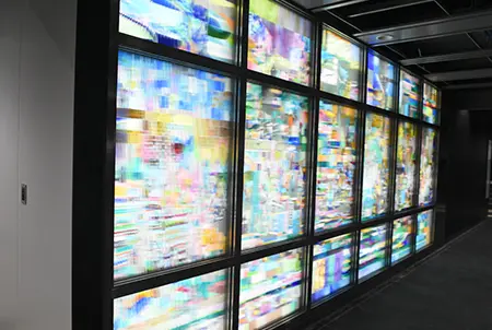 The work is made of stained glass with built-in LEDs, and measures approximately 2.7 meters in height and 6 meters in width. It uses a total of 3,351 pieces of glass of 243 types. Lens-shaped glass, which changes its appearance depending on the viewing angle, is layered on top of the stained glass to create a sense of three-dimensionality and movement.