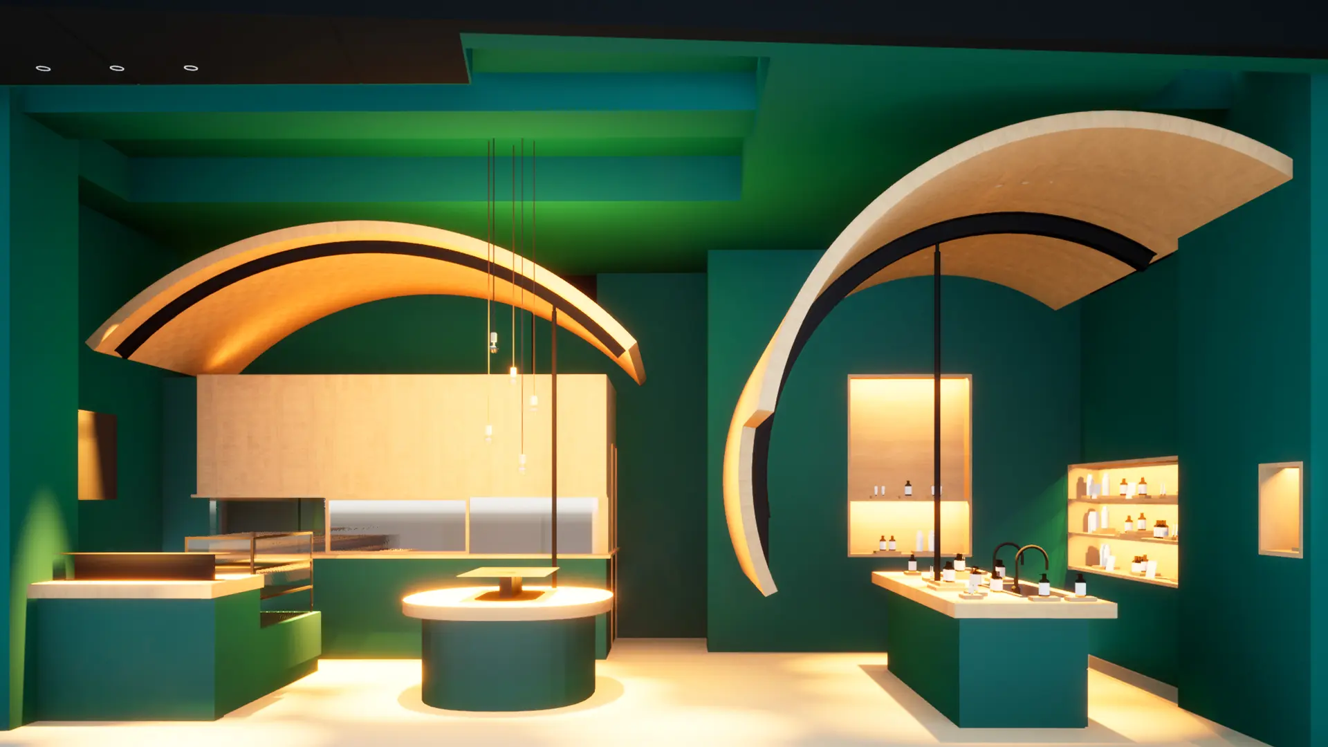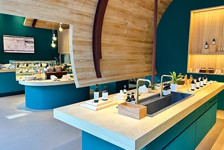 The store itself features distinctive arched canopies made from Nakatsugawa cypress, and a green interior which evokes a Japanese forest, to create a relaxing shopping experience for the customer.