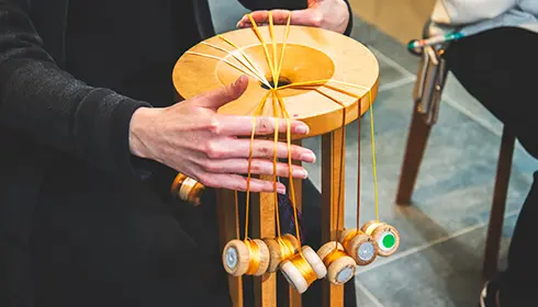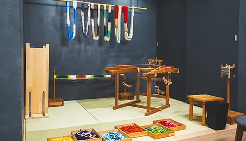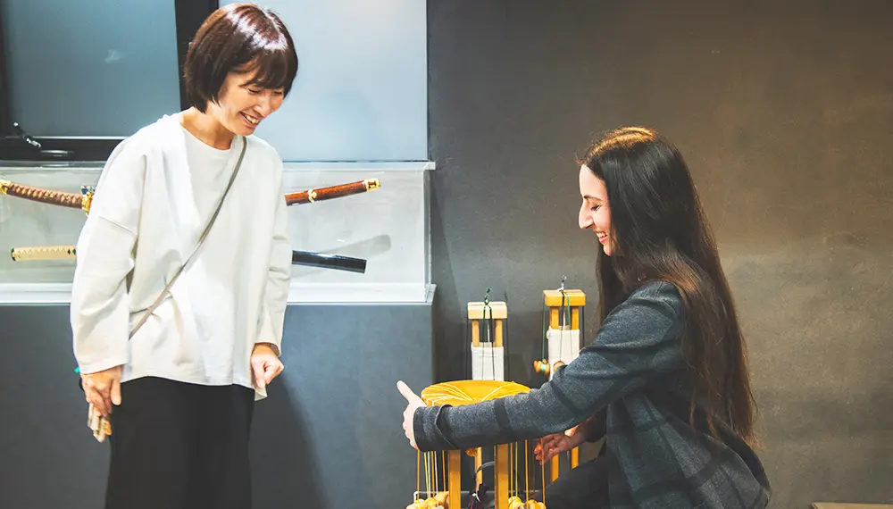 The Kumihimo experience, with English support available, starts with an explanation of Kumihimo’s history and showcases beautifully restored Kumihimo from the eighth to thirteenth centuries. Then, it is your turn to braid using the same materials and equipment as Domyo’s artisans. A friendly instructor guides you through the initial steps. At first, the weaving process is difficult to follow. However, thanks to the repetitive nature of the activity, the hand movements become reflexive—lulling you into a calm meditative state. It is fulfilling to see your Kumihimo lengthen with each motion. At the end, you are left with a beautiful braided cord that reflects your state of mind.