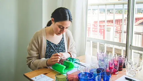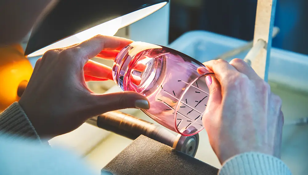 The workshop offers a variety of glass types, colors, and patterns to choose from, with geometric and nature-themed designs being popular. Start by practicing the glass cutting technique, and then design your own one-of-a-kind glass. At first, the glass’s cylindrical shape makes it challenging to precisely engrave a design. However, as you practice, you become familiar with how you can use the grinding wheel to create numerous unique patterns. It is thrilling to watch your vision come to life through such a unique artistic method.