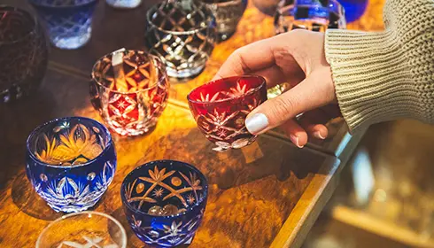 Dating back to 1834, Edo Kiriko is a prestigious Japanese glass craftwork—beloved for its sophisticated patterns. Under light, these Edo Kiriko glasses truly shine, projecting colorful shadows adorned with intricate designs. At Sokichi, a shop that sells over 1,000 types of glassware, you can participate in an authentic Kiriko glass-cutting experience that uses the same machines and blades as professional artisans.