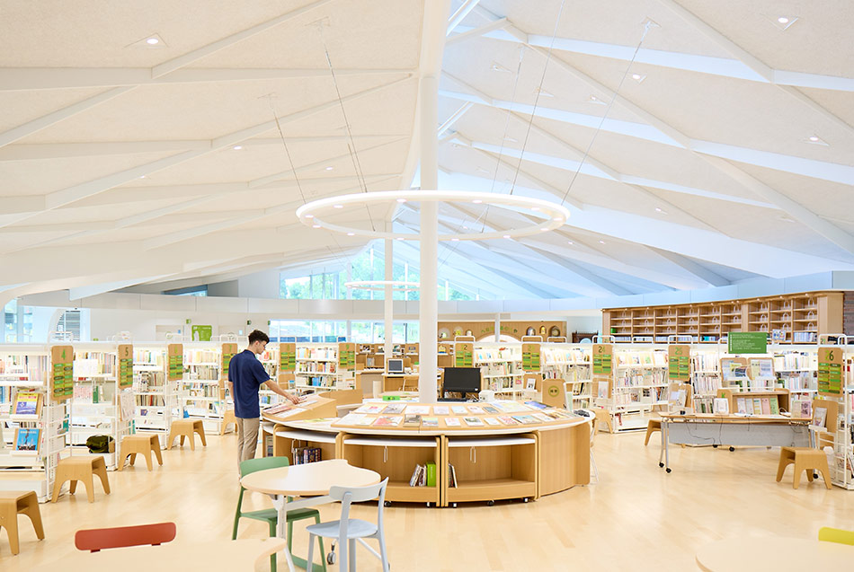 The second floor is a space for connection. Low bookshelves and high ceilings open the library to the space outside, and tree-shaped pillars evoke a forest. Visitors are encouraged to talk and mingle. The building is curved following the lines created by the park’s paths, allowing it to fit snuggly with the rest of the park. There is a café on the second floor with a terrace overlooking a large pond to the east. The area surrounding said pond is officially called Book Park, and visitors are encouraged to read on the rolling lawn after checking out. *Book Park's construction is expected to be completed by mid-October 2023.