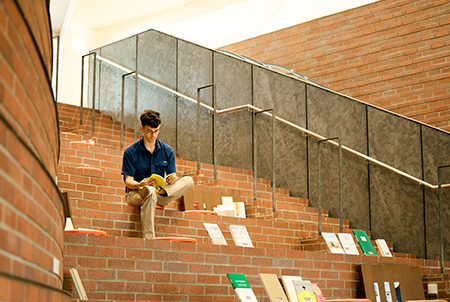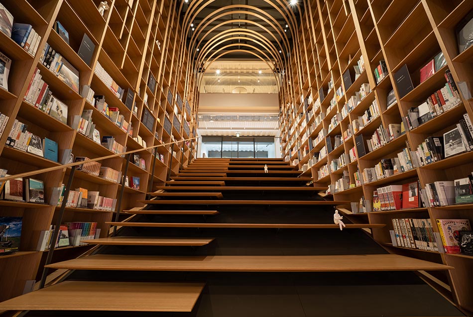 Tama City Central Library is a versatile space seamlessly integrated with a nearby park. It is located in Tama, in the western half of the Tokyo metropolitan area. Around the nearby Tama-Center Station, there are many large department stores and green spaces. The library is actually located in Tama Central Park, allowing visitors to drift between the park and the library. Follow Brick Slope to the front entrance, which continues inside the library. You are greeted by Step Plaza, a large staircase where you can sit down and read. This stairway serves as a transition between the two main floors. The library is modeled after the worlds under-ground and above-ground in a forest. The first floor is a space for quiet reading. Tall bookshelves and low ceilings bring you in close contact with the books, and brown accents evoke an underground cave.