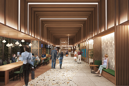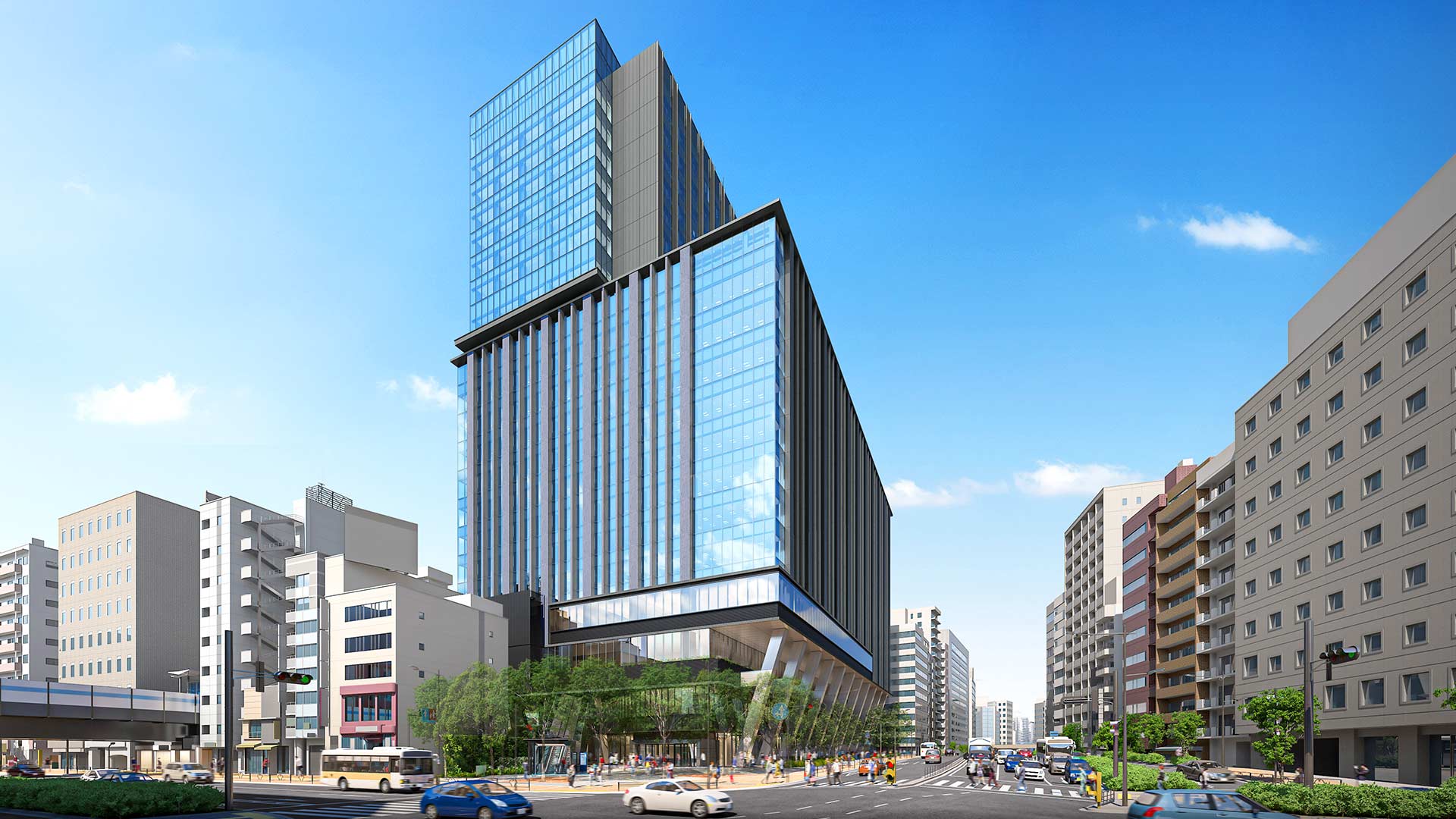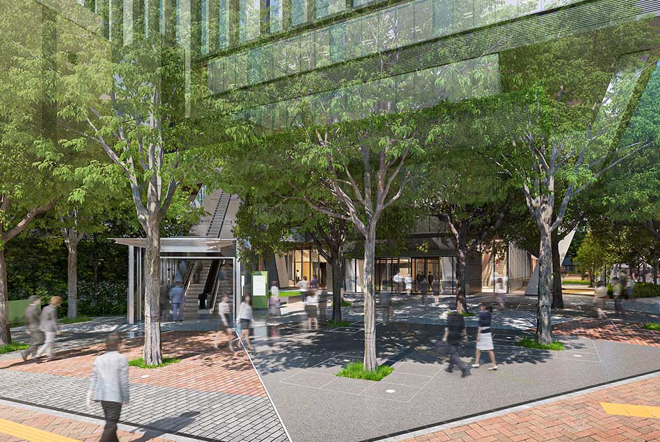 A food hall on the first floor will be easily accessible to local residents and visitors alike. The second floor will be a shared office space, aimed at promoting collaboration and innovation among business, including start-up companies. Meanwhile, the third floor will have a multipurpose hall, designed to support a range of cultural, business and entertainment activities. The 3rd to 12th floors will provide one of the largest floor areas for offices in the Gotanda area. A Hoshino Resorts hotel will occupy the 14th to 20th floors, with a restaurant and an open terrace with great views over the city. These will also be accessible to visitors not staying at the hotel. Around the building, a “Gotanda Forest” will be created with newly-planted trees.