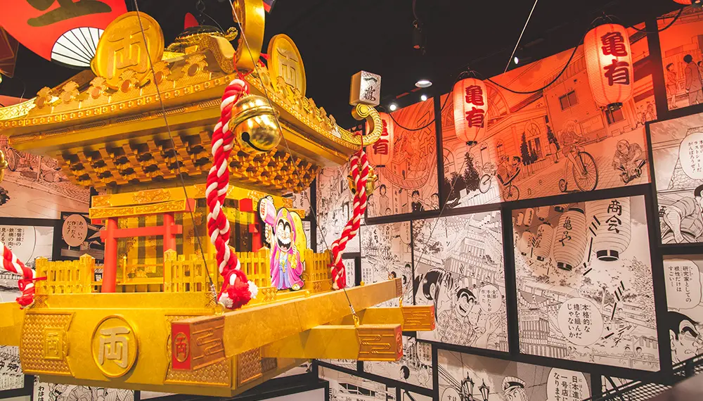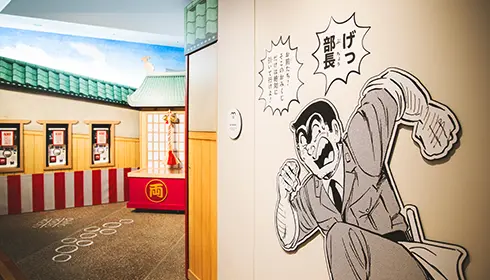 When you visit, first take the elevator to the fifth floor, which displays Kochikame-related vintage products and items that Akimoto used as references for his artwork. It also has a mock shrine that Ryo-san built in one well-known story. At the shrine, you can get a Kochikame-themed omikuji, or paper strip that tells your fortune. You can even ring the shrine's bell.