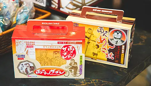 These products include wagashi such as dorayaki, a small pancake-like confection with a sweet anko filling, as well as chocolate cookies and French sable cookies. The chocolate cookies are deliciously chewy and feature Kochikame characters on their packaging.