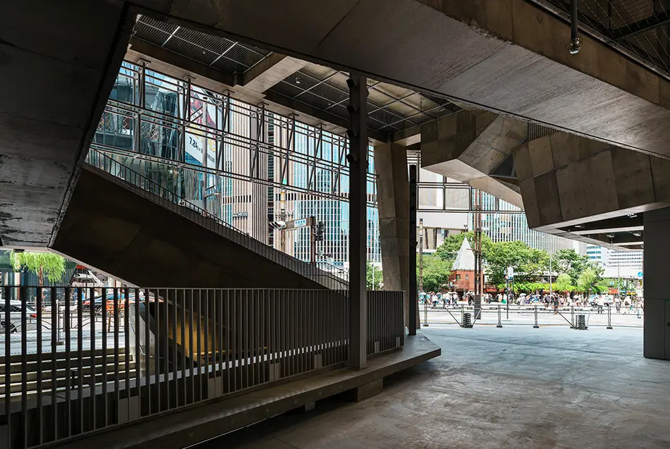 The ground level faces three major streets in Ginza, the second basement level is directly connected to the subway concourse, and the third basement level is connected to one of the largest underground parking lots in the area. Additionally, on the ground level, there is no boundary between the inside and outside of the park, continuing its philosophy of being a "facility open to the public."