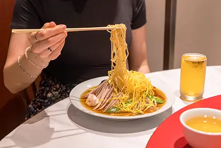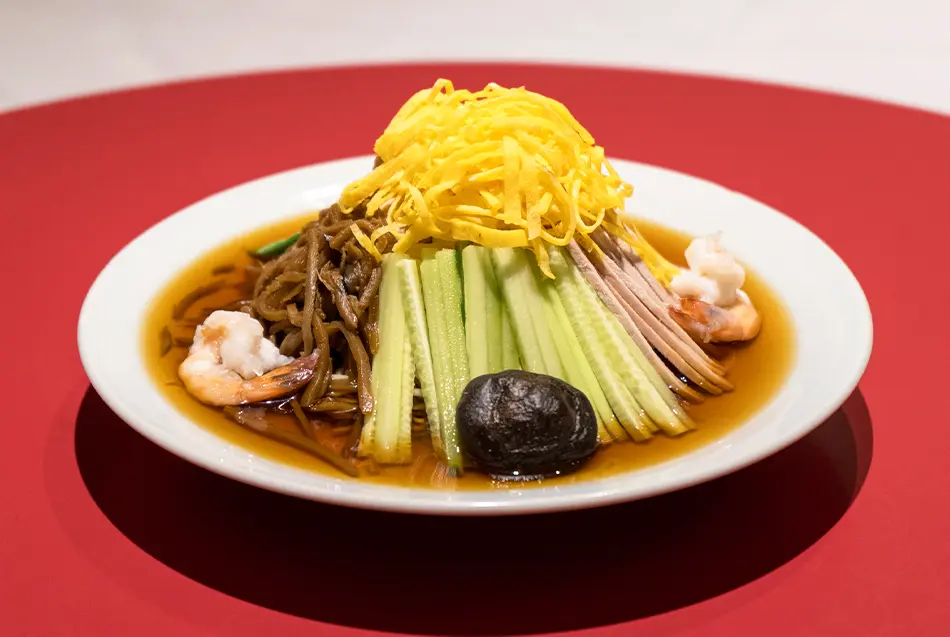 Yosuko Saikan, opened in 1906, is a restaurant renowned for its Hiyashi Chuka. The chewy noodles are piled high with 10 fresh and in-house cooked ingredients, including meat, vegetables, and seafood—making it a well-rounded dish. The ingredients are vertically arranged to resemble Mt. Fuji and doused in the addicting sauce. Yosuko Saikan recommends that you eat a piece of cucumber first to cool your throat before mixing all the ingredients together and enjoying the dish. After the meal, you are guaranteed to feel revitalized.