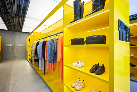 The collection inside consists of items which Onitsuka Tiger presented at Milan Fashion Week in February 2023. Bold yellow shelving and racks display the company’s stylish and practical shoes, as well as clothing for both men and women under the concept of "Urban Layering" – the idea of coordinating different layers of clothing that the company calls an essential element of Japanese culture.