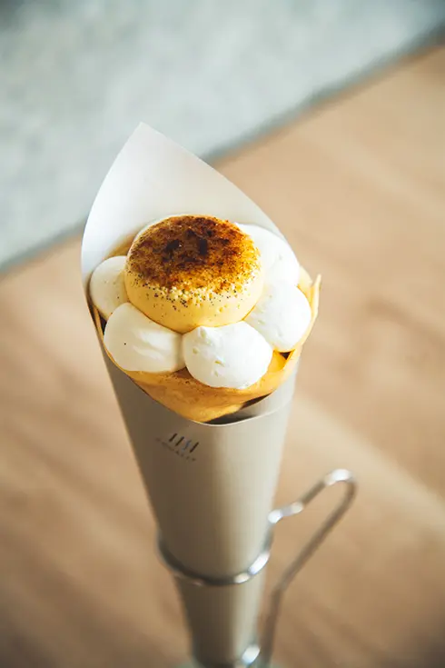His signature item is the seasonal specialty crepe, which changes every month or so. It's a beautiful cone-shaped concoction featuring seasonal fruits, sometimes decorated with edible gold leaf and piled high with ingredients and whipped cream. Dig in and you'll find that the taste changes as you eat it, almost like a parfait: different layers feature different toppings mixed into the crepe, so each bite is a delicious new discovery.
