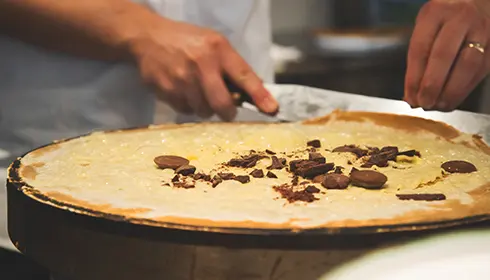 Dubai chocolates are trendy, luxurious chocolates first made in Dubai that contain pistachio and kadaif, thin pastry noodles made from flour and water. They were chosen as the Jiyugaoka store's signature item because their luxurious taste matches the luxurious feel of the neighborhood. Staff members handmake the Dubai chocolates in-store and add them to the top of the crepes.