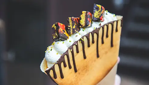 There is melted chocolate and whipped cream inside the crepes, along with the cream made from pistachio paste and kadaif that's used to make the chocolates. The crepes have a chocolate topping that's gone viral on social media for its cute, melted design. The rich chocolates and light whipped cream are the perfect pairing, and the crunchy crust of the crepe gives way to a slightly softer texture toward the middle. It's a rich, chocolatey, satisfying dessert.