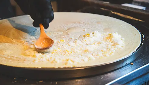 For example, Tomono mixes Japanese and French flour to make the batter and develops different flavors of cream to use with different toppings. He cooks the batter differently for different styles of crepe, so handheld ones will be perfectly soft and French ones perfectly crunchy around the edges.