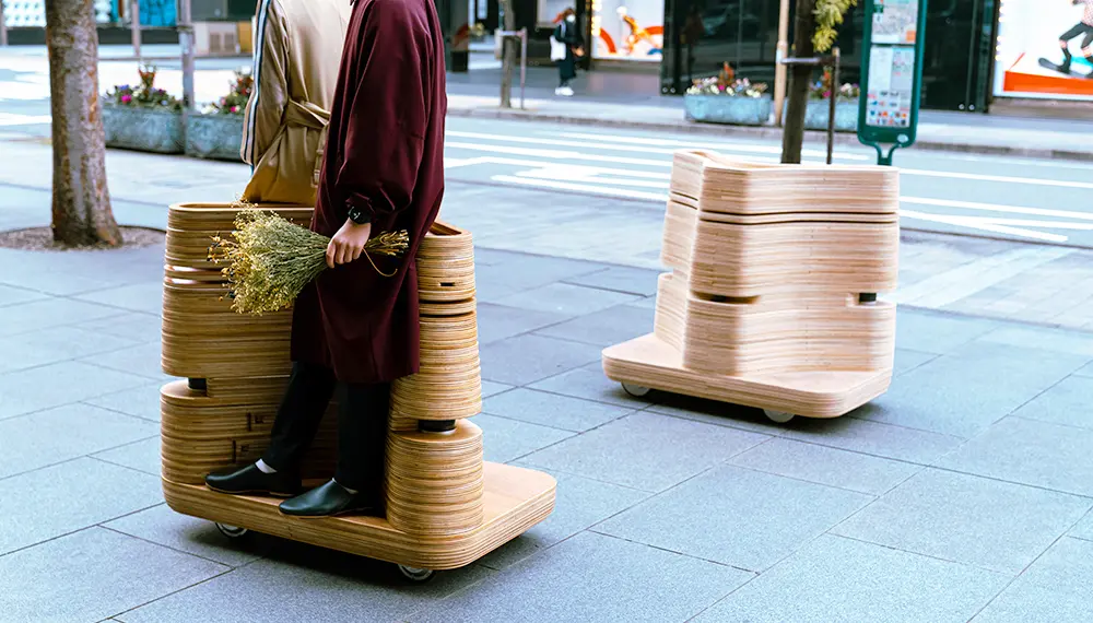 The vehicles travel slowly enough to run on pedestrian walkways, including the promenade that connects the Takanawa Gateway City buildings, and some are powered by hydrogen. The mobility of the platforms increases accessibility by allowing users to move through buildings without having to walk. Because of their unique design and shape, they're a fun way for users to experience a new form of transportation. People of all ages can enjoy gliding over walkways while taking in the views of the park.