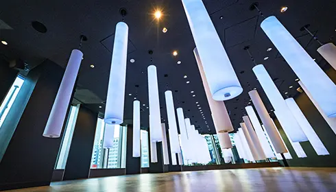 Zero-Site Takanawa Gateway is a bar with a focus on high-quality service and sustainability. The space features kinetic art installations and hosts events featuring art, fashion, design, and more. The art installations include lamps and light displays that light up at night, forming a sort of nighttime art museum. Customers can look at these displays while enjoying ethically sourced beverages and food.